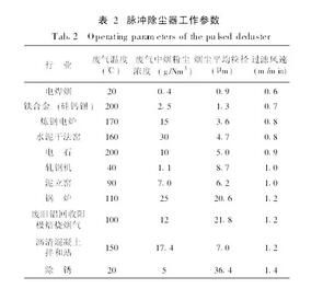 過濾風速到底和廢氣溫度、煙粉塵濃度有何具體關系,我們可從實驗上加以研究,表2是作者為各行業(yè)設計的除塵器的工作參數表(僅選取了除塵效率在9919%以上的設備或出口排放濃度小于30mg/Nm3的設備)。