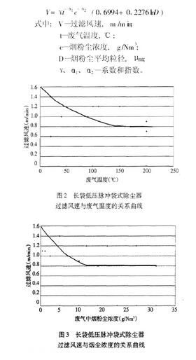 該式雖是通過曲線擬合得到的,但我們在2005年后設計脈沖除塵器時,其過濾風速的選取均是采用該模式計算,每臺除塵器的除塵效果都達到了要求(除塵效率達到99.9%或排放口濃度小于30g/Nm3)。