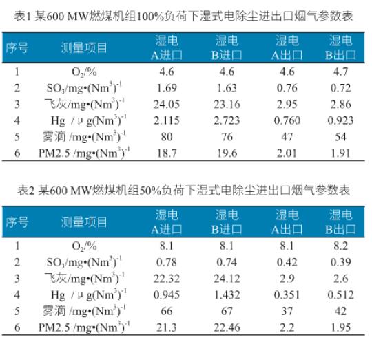 針對(duì)某600MW燃煤機(jī)組工程化應(yīng)用在100%負(fù)荷及50%負(fù)荷條件下進(jìn)行了測(cè)試,測(cè)試結(jié)果詳見表1和表2,出口煙塵濃度均滿足設(shè)計(jì)值,也大大低于超低排放標(biāo)準(zhǔn),同時(shí)濕電對(duì)三氧化硫、汞及霧滴的協(xié)同脫除作用也非常明顯。