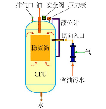 CFU工作原理如圖 1所示。采出水主體水流先經(jīng)自制的微氣泡發(fā)生器注入大量的微氣泡,然后沿切向入口進入浮選罐,在罐壁與內部穩(wěn)流筒之間形成的環(huán)形空間內產(chǎn)生旋流,旋流引起的離心力場驅使氣泡與油滴**黏附,黏附氣泡后的油滴與水的密度差進一步加大,進而加速浮升,提高了油水分離效率,實現(xiàn)對生產(chǎn)水的**處理,同時大大縮短水力停留時間,減小了處理設備的尺寸。其中,自行研制的微氣泡發(fā)生器利用微孔發(fā)泡機理,通過微孔對氣流進行連續(xù)剪切后經(jīng)水流沖刷而形成微氣泡,有效規(guī)避了常規(guī)氣泡發(fā)生方式能耗高、產(chǎn)生氣泡性能差、剪切乳化程度高等不足〔4, 5, 6〕,微氣泡發(fā)生器的優(yōu)越性能也為CFU除油效率的提高提供了保障