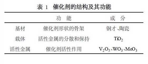 組成:一般,催化劑是由①基材(構(gòu)成催化劑的骨架) 、②載體(使活性金屬成分能夠較好的分散合保持的材料)以及③活性金屬(起催化作用的成分)構(gòu)成。但現(xiàn)在使用的蜂窩狀催化劑不是用基材的,它是把載體材料本身作為基材制成蜂窩狀。表1為催化劑的結(jié)構(gòu)及其功能。